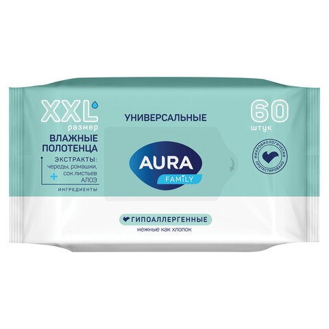 Полотенца влажные (60шт/уп), БОЛЬШИЕ XXL 17х27см, AURA "Family" 60656 117682