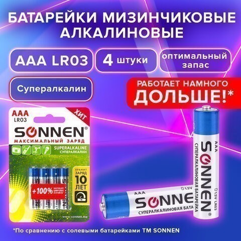 Батарейки КОМПЛЕКТ 4 шт, SONNEN Super Alkaline, AAA (LR03, 24А), мизинчик., блистер, 451096